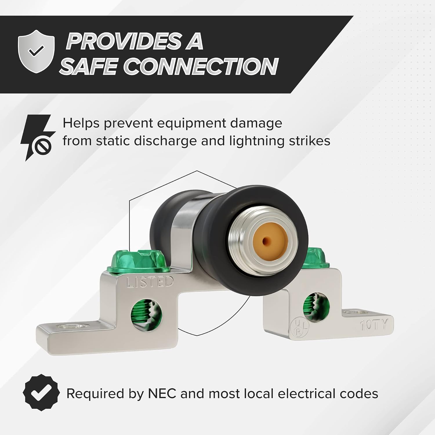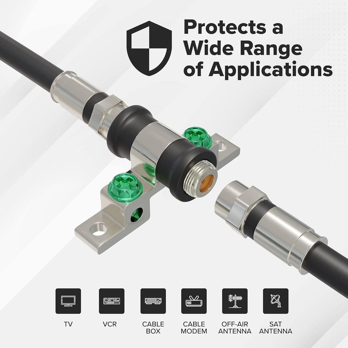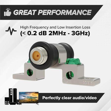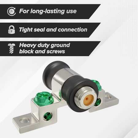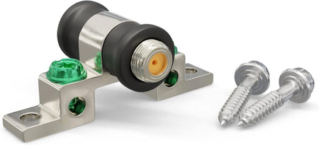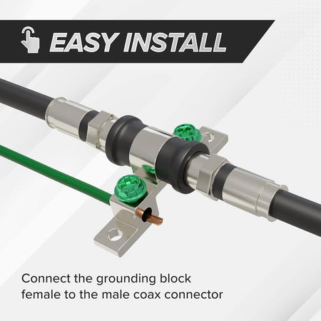 This 3GHz coaxial cable grounding block is designed to provide secure, code-compliant connections for RG6 coaxial cable installations. Featuring an F-type single port design, it works with satellite, cable TV, broadband, antennas, RV, and off-air systems. It ensures signal clarity while meeting NEC and most local electrical code requirements for grounding.
