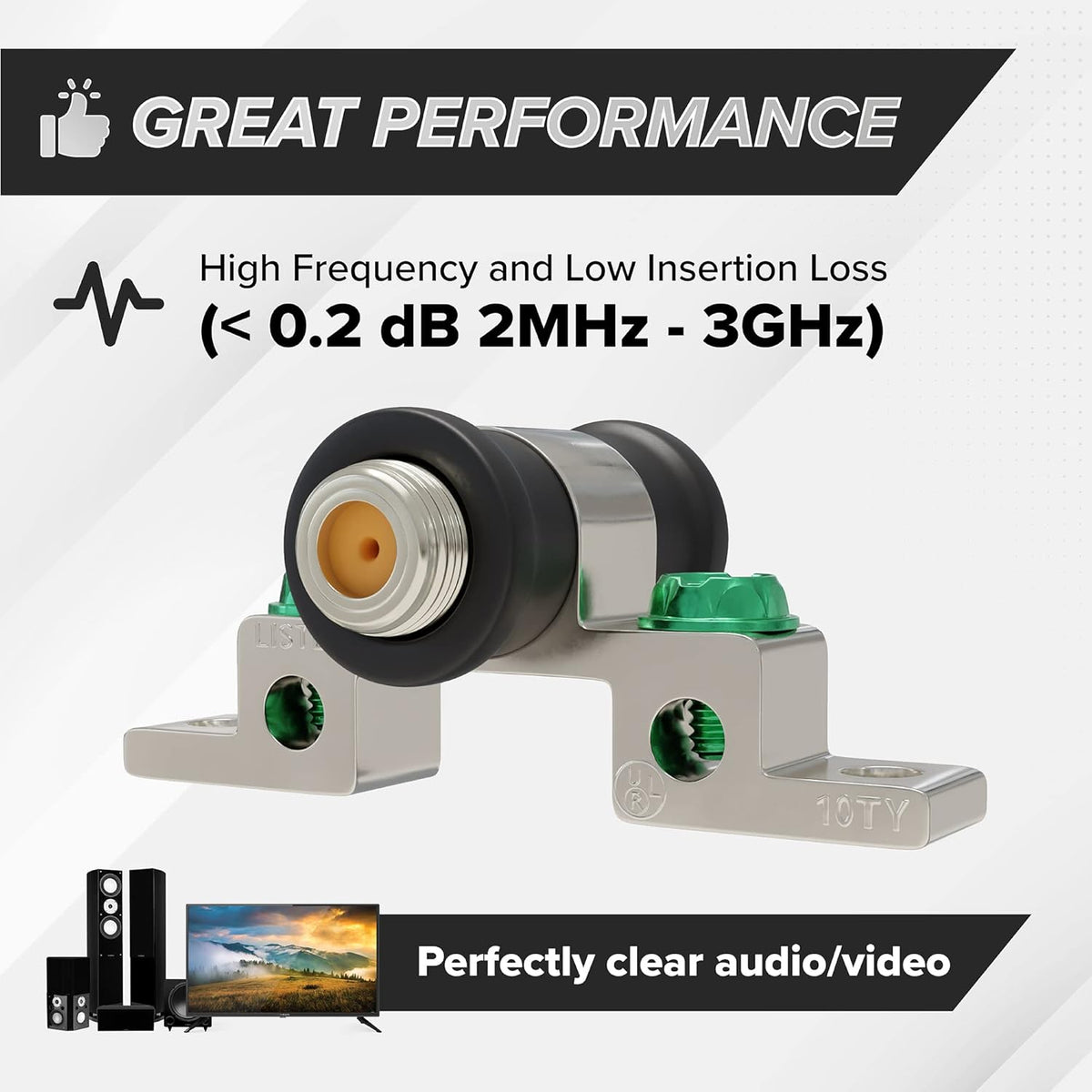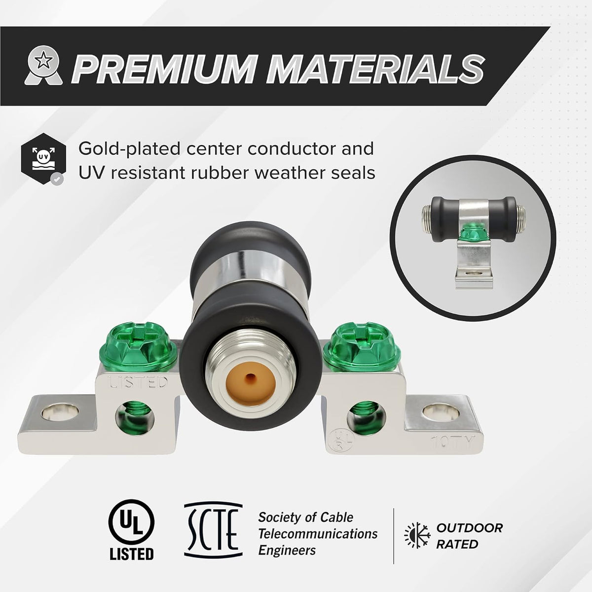 Engineered with a gold-plated center conductor and UL-listed components, this grounding block offers high-frequency support up to 3GHz with minimal insertion loss (<0.2 dB between 2 MHz and 3 GHz). UV-resistant rubber weather seal boots provide protection against the elements, making it suitable for both indoor and outdoor installations.